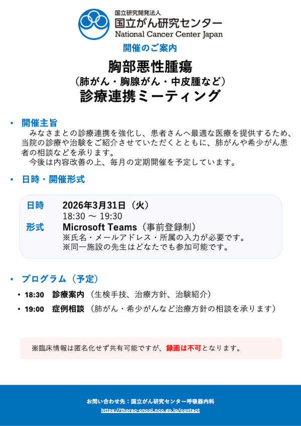 お問い合わせ内容の欄に「3⽉31⽇胸部悪性腫瘍診療連携ミーティング参加希望」と明記の上、ご連絡ください。